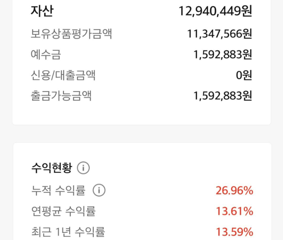상품마다 투자를 시작한 시기, 금액, 비율이 달라 수익률 및 평가금액에 차이가 많아 참고로 보시면 좋을 것 같습니다.